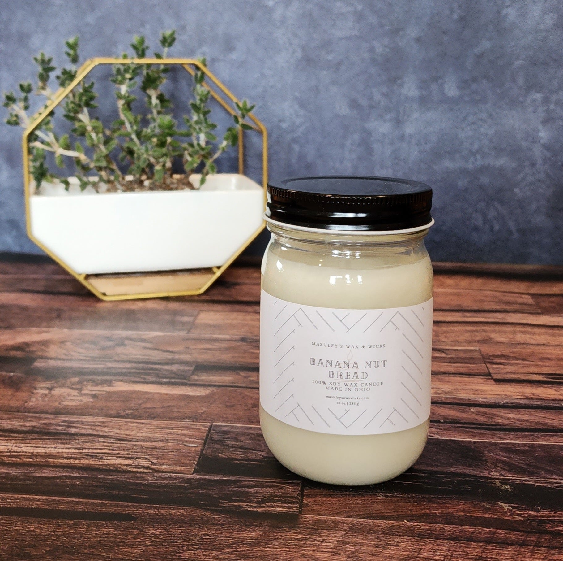 A 10.5 ounce Mango Colada scented candle in a clear, Mason style jar with black lid.