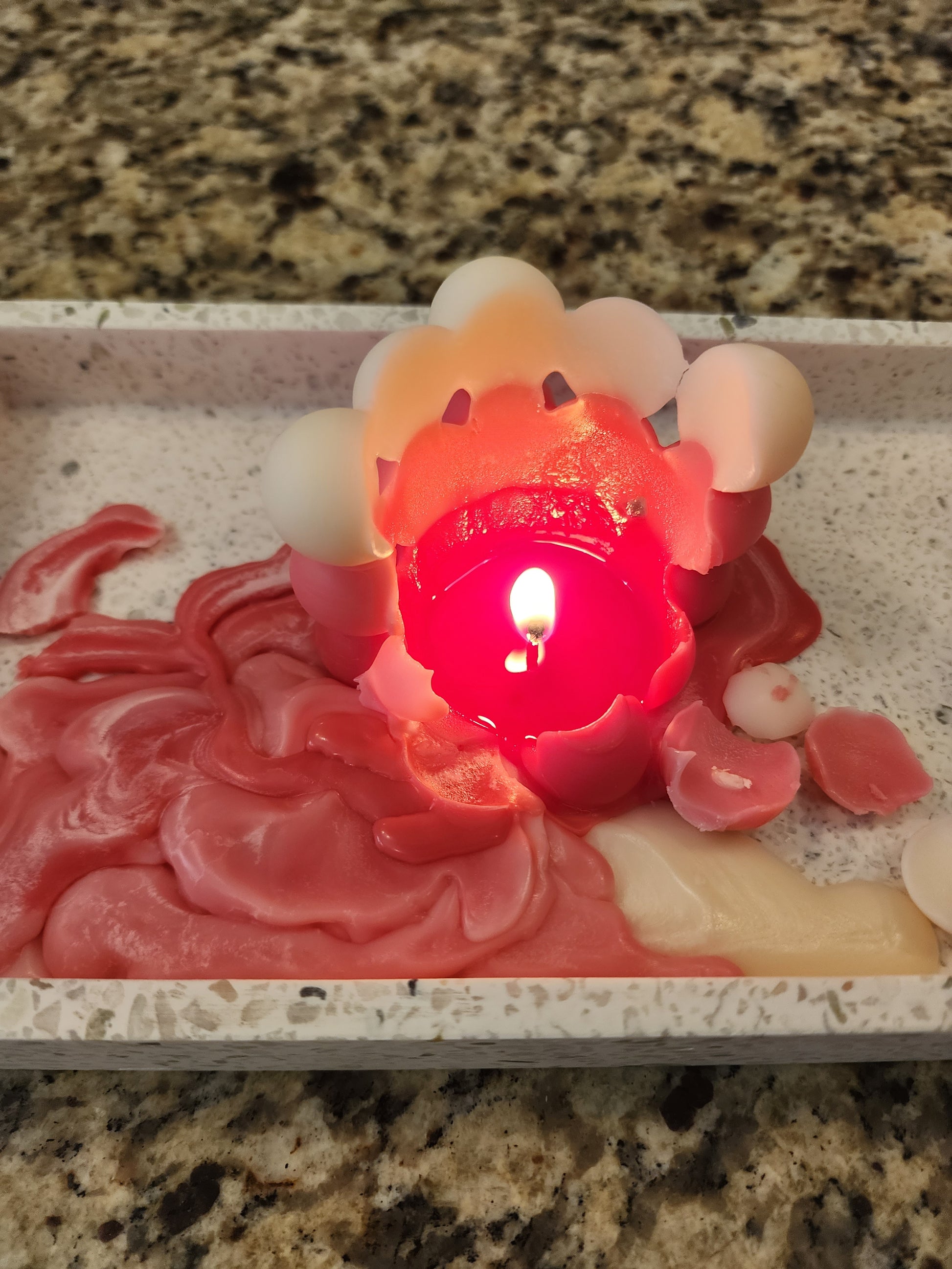 A 5.5 oz Rose Petals scented pillar candle. Pink ombré. Burn time 4-6 hours