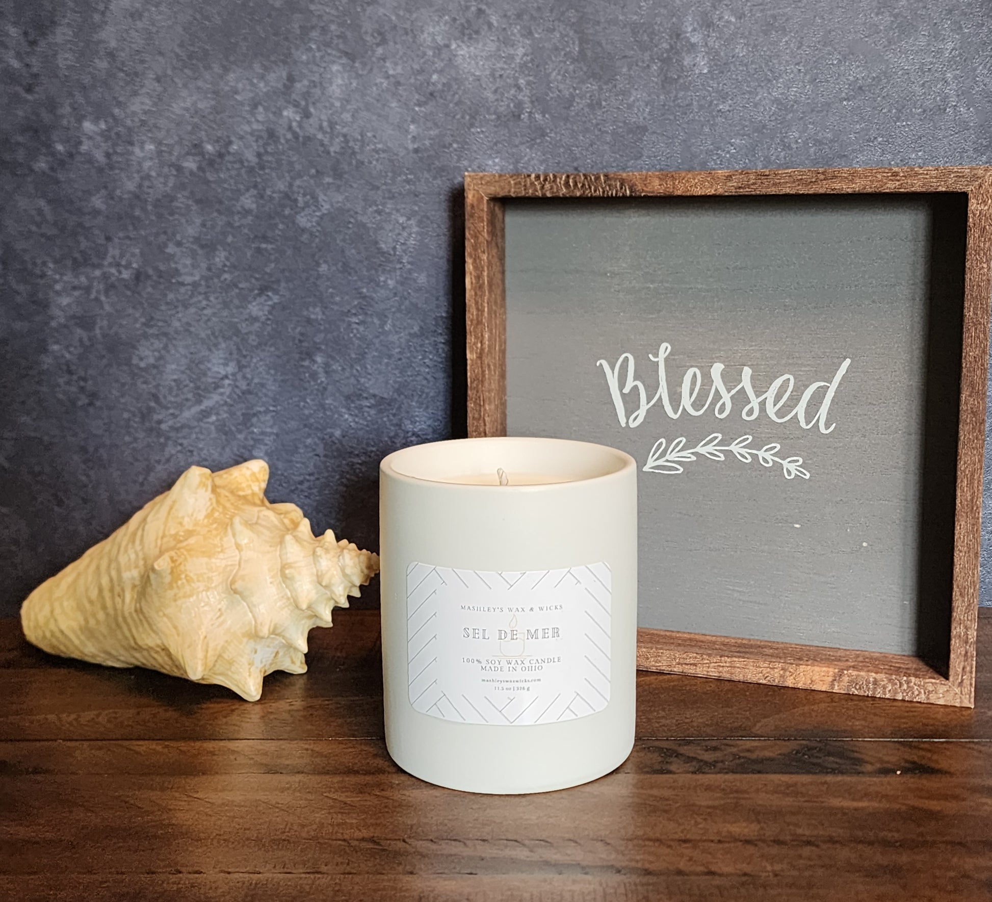 A white ceramic jar with bamboo lid, candle is 11.5 ounces and sea salt scented